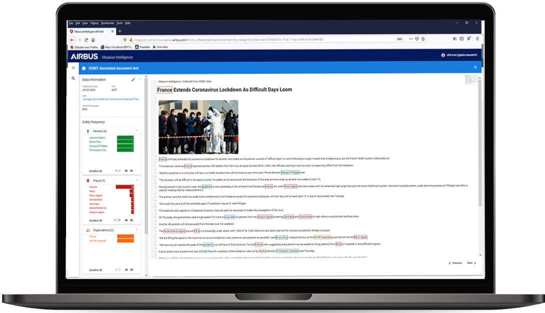Thanks to Artificial Intelligence (AI), Open Source Intelligence Software allows automatic information extraction and automatic processing within the cloud, providing recognition of entities of interest (person, place, organisation, event, equipment), semantic analysis, automatic translation tools, speech to text, video / audio filtering, Optical Character Recognition (OCR) and speaker identification.