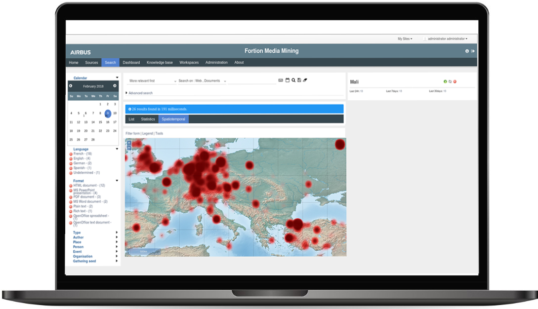 While capitalising knowledge, the user benefits from advanced search functionalities such as advanced text search with facet, semantic search, visual search, multimedia search, spatial view of entities, network view of entities, information correlation and automatic entity extraction…