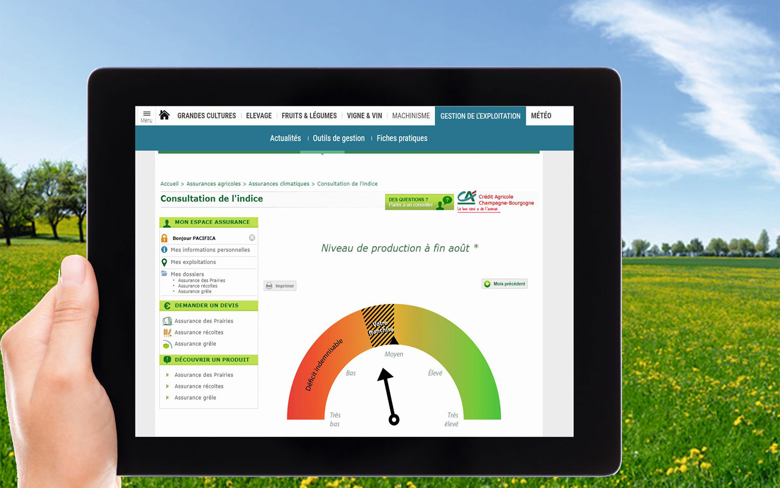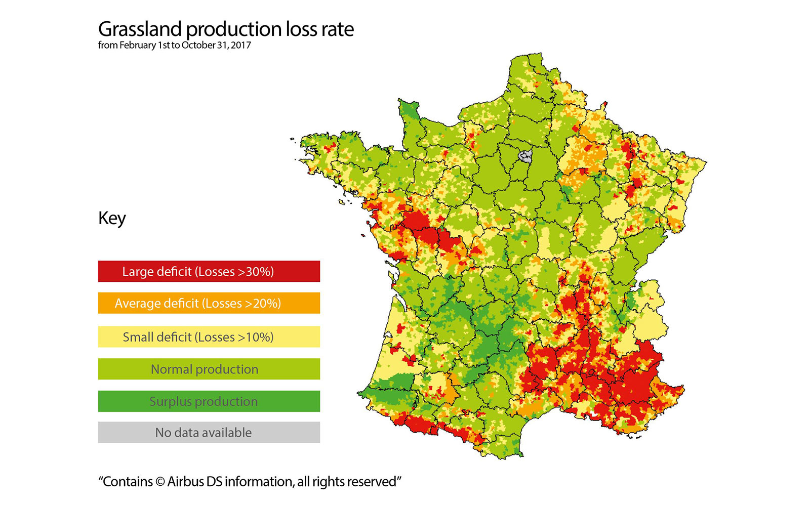 Maps representing the percentage of green vegetation cover (fCover) are derived from the satellite imagery. This data is used to generate the Grassland Production Index (GPI) per country which represents the accumulated biomass produced daily from February 1st to October 31st of each year. The correlation between this index and real growth was scientifically established over seven years of research. A committee of scientific experts, under the auspices of the Ministry of Agriculture, also approved using this index in an insurance product.
