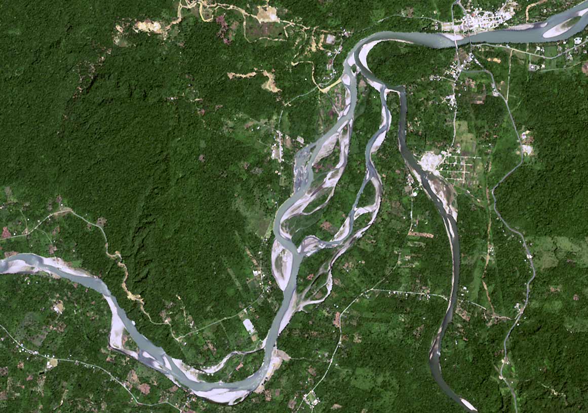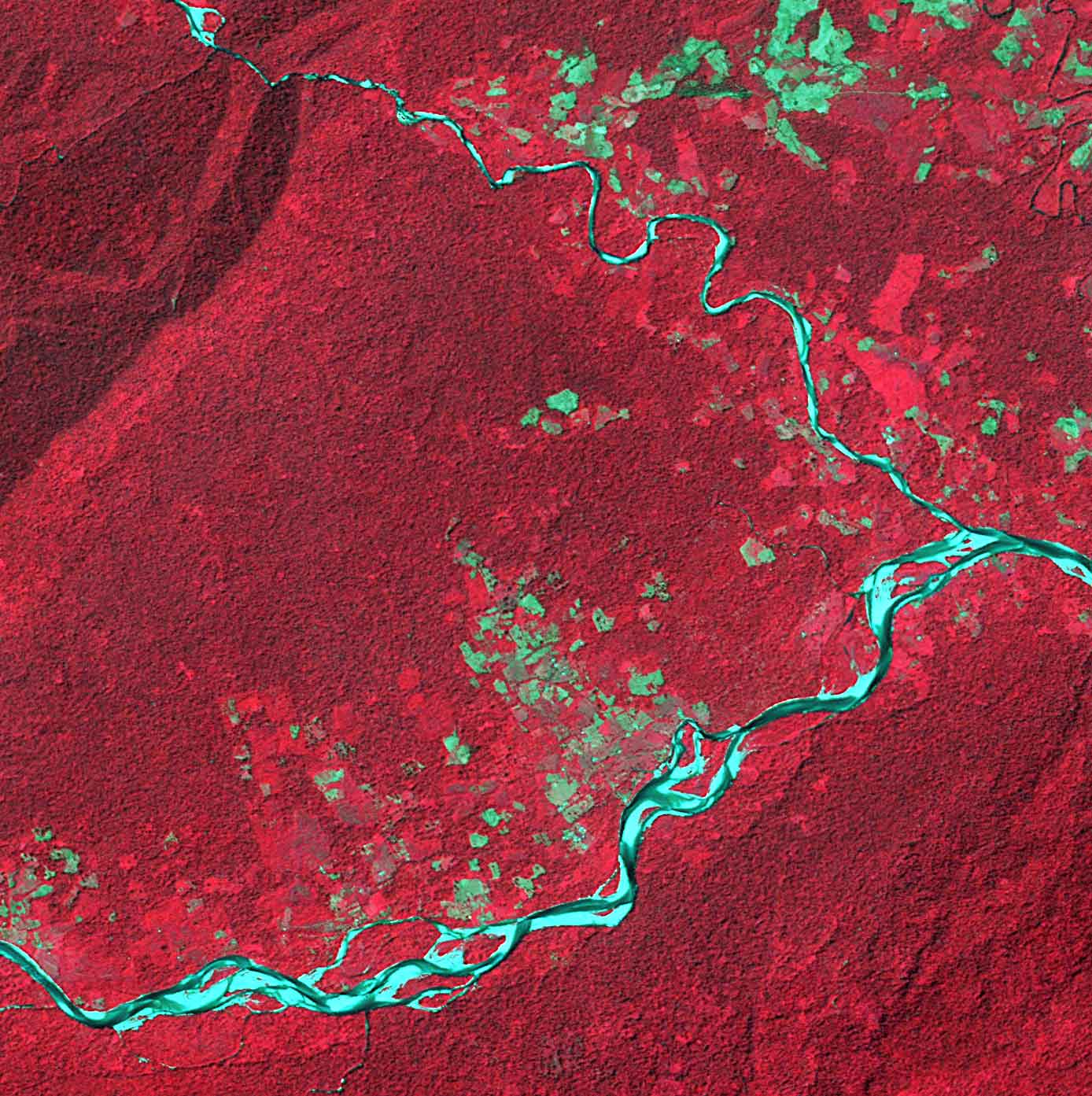 This SPOT 5 image from 2007 and SPOT 6 image from 2013 shows the progression of deforestation on the northern shore of Colombia, around the Rancheria River (which forms the border between Columbia and Ecuador), whilst in southern Ecuador the forest remains unexploited.