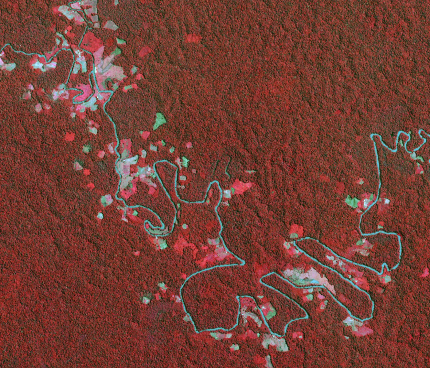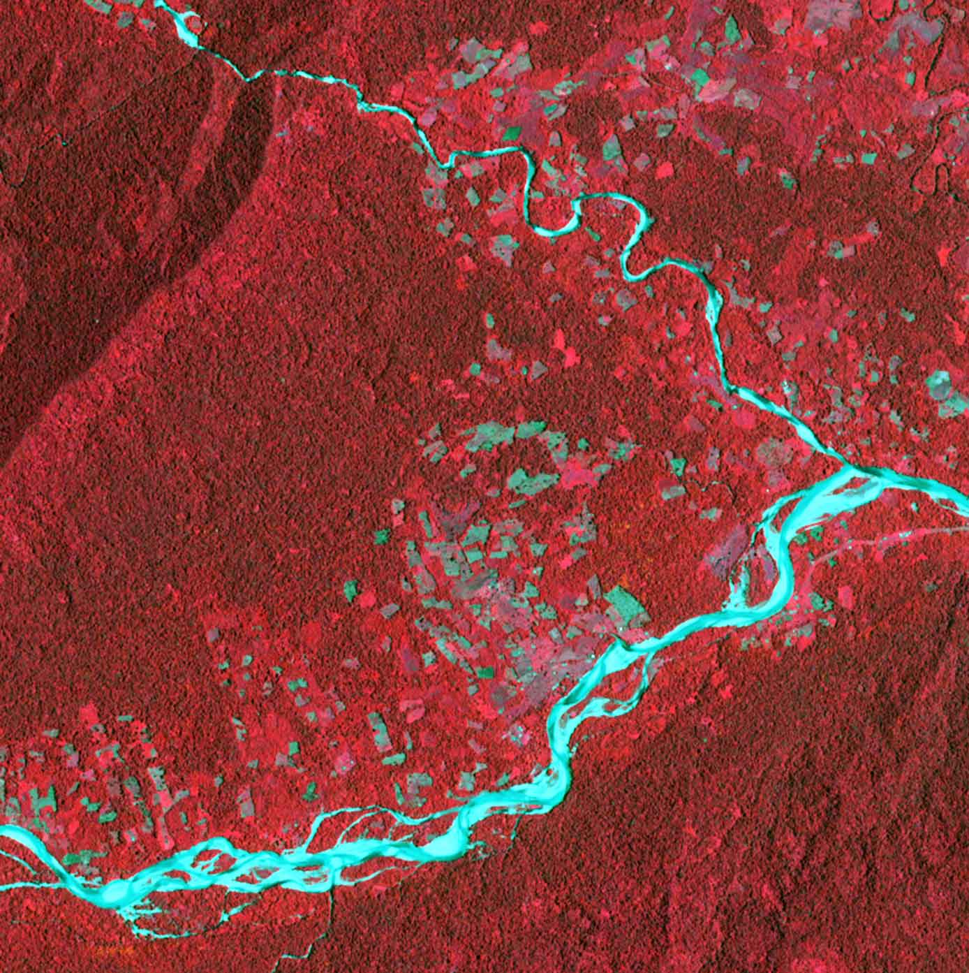 Deforestation takes place by the Mecaya, located in Colombia. The analysis of SPOT 5 imagery from 2007 and SPOT 6 imagery from 2013 shows the progression of deforestation by small patches in clusters from the river.