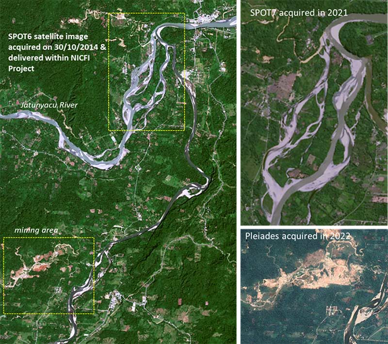 The MAAP initiative highlights one of these cases. One Airbus SPOT 6/7 high resolution image dated back to 2014 was provided to the NICFI data program, and unveils the environmental conditions and landscape 8 years ago. Acquired in 2021, a new SPOT 6/7 image witnesses drastic expansion of gold mining exploitation and the true impacts on the Ecuadorian Amazon rainforest.